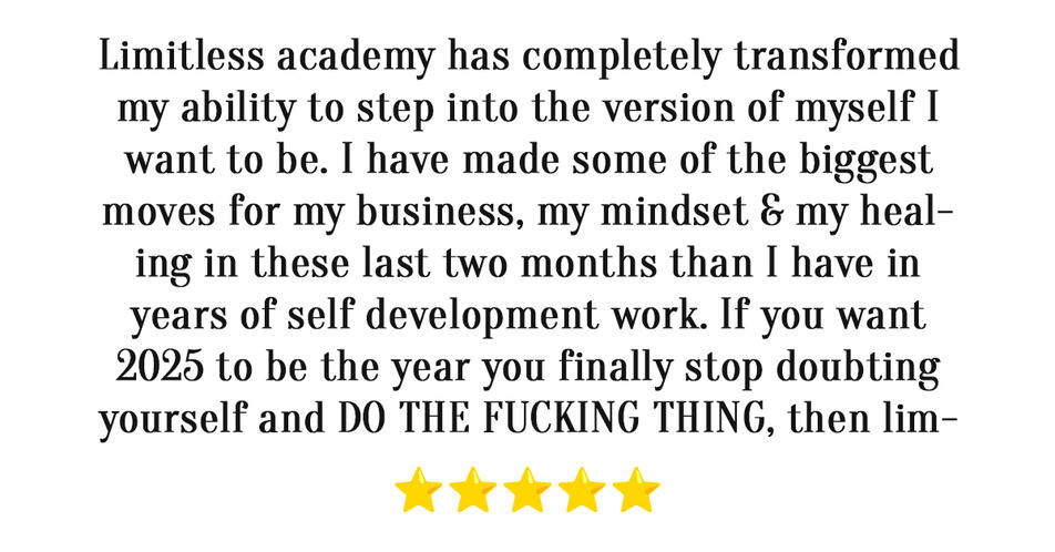 Most programs teach information. We install identity. Inside Limitless Academy, you’ll build a self‑image that’s so strong it changes how you show up, decide, love, lead, and receive. You’ll learn to regulate your nervous system, rewire limiting patterns, and move through life with grounded confidence.♥ Release the old patterns and self-doubt